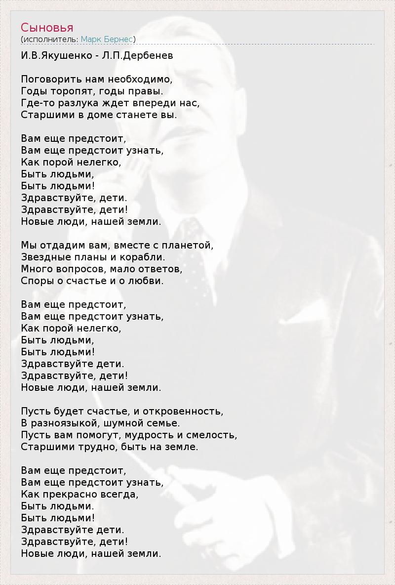И.В.Якушенко - Л.П.Дербенев Поговорить нам необходимо, Годы торопят, годы правы. Где-то разлука ждет впереди нас, Старшими в доме станете вы. Вам еще предстоит, Вам еще предстоит узнать, Как порой нелегко, Быть людьми, Быть людьми! Здравствуйте, дети. Здравствуйте, дети! Новые люди, нашей земли. Мы отдадим вам, вместе с планетой, Звездные планы и корабли. Много вопросов, мало ответов, Споры о счастье и о любви. Вам еще предстоит, Вам еще предстоит узнать, Как порой нелегко, Быть людьми, Быть людьми! Здравствуйте дети. Здравствуйте, дети! Новые люди, нашей земли. Пусть будет счастье, и откровенность, В разноязыкой, шумной семье. Пусть вам помогут, мудрость и смелость, Старшими трудно, быть на земле. Вам еще предстоит, Вам еще предстоит узнать, Как прекрасно всегда, Быть людьми. Быть людьми! Здравствуйте дети. Здравствуйте, дети! Новые люди, нашей земли.