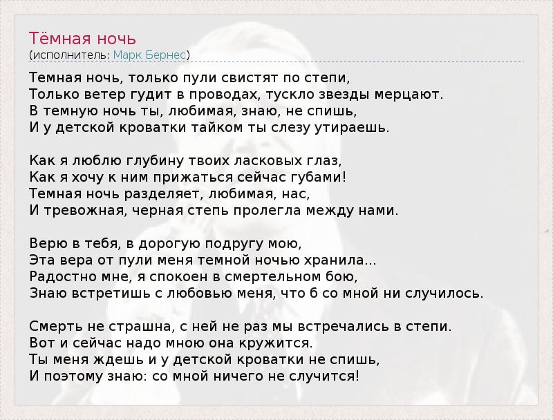 А как ты думаешь, о чем песня "Тёмная ночь" ?