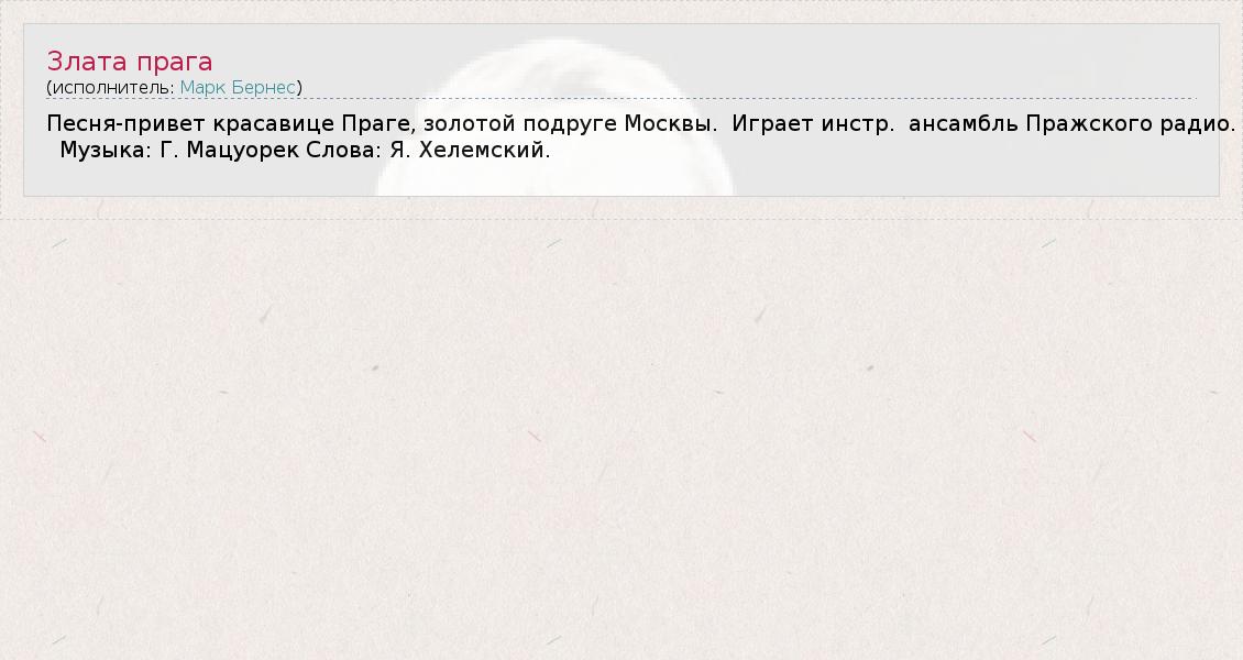 Песня-привет красавице Праге, золотой подруге Москвы.  Играет инстр.  ансамбль Пражского радио.