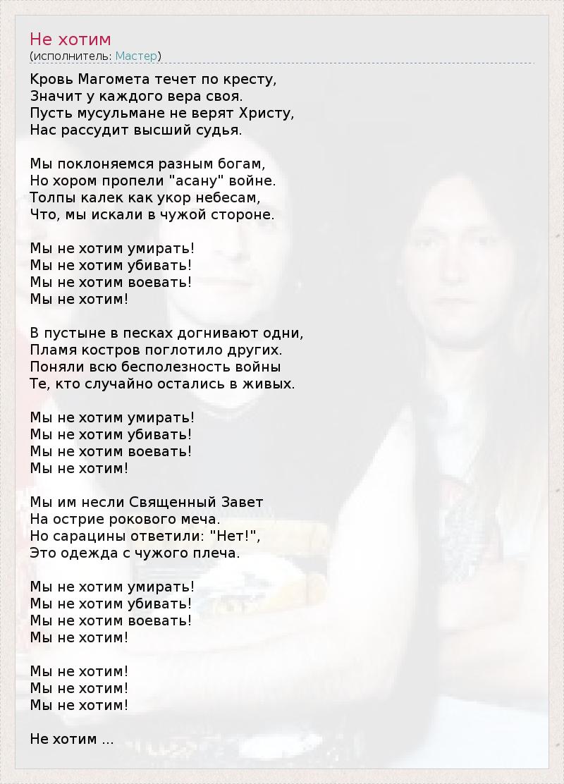 Мастер - Не Хотим http://megalyrics.ru/lyric/%D0%BC%D0%B0%D1%81%D1%82%D0%B5%D1%80/%D0%BD%D0%B5-%D1%85%D0%BE%D1%82%D0%B8%D0%BC.htm#ixzz1wH4kiKOZ