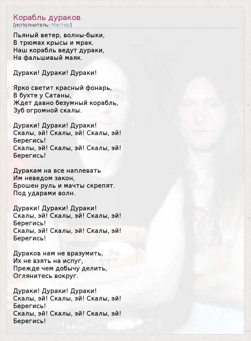 Мастер - Корабль дураков http://megalyrics.ru/lyric/%D0%BC%D0%B0%D1%81%D1%82%D0%B5%D1%80/%D0%BA%D0%BE%D1%80%D0%B0%D0%B1%D0%BB%D1%8C-%D0%B4%D1%83%D1%80%D0%B0%D0%BA%D0%BE%D0%B2.htm#ixzz1wH6ClIqI