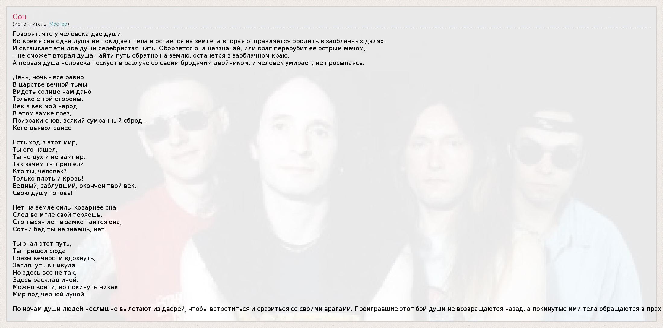 Мастер - Сон http://megalyrics.ru/lyric/%D0%BC%D0%B0%D1%81%D1%82%D0%B5%D1%80/%D1%81%D0%BE%D0%BD.htm#ixzz1wH4TEqdS