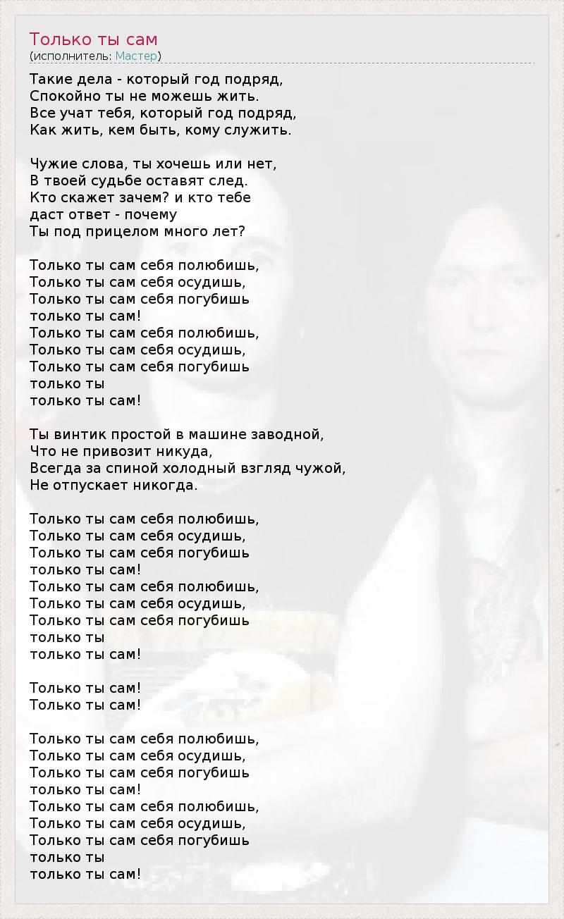 Мастер - Только ты сам http://megalyrics.ru/lyric/%D0%BC%D0%B0%D1%81%D1%82%D0%B5%D1%80/%D1%82%D0%BE%D0%BB%D1%8C%D0%BA%D0%BE-%D1%82%D1%8B-%D1%81%D0%B0%D0%BC.htm#ixzz1wH5ghNsS
