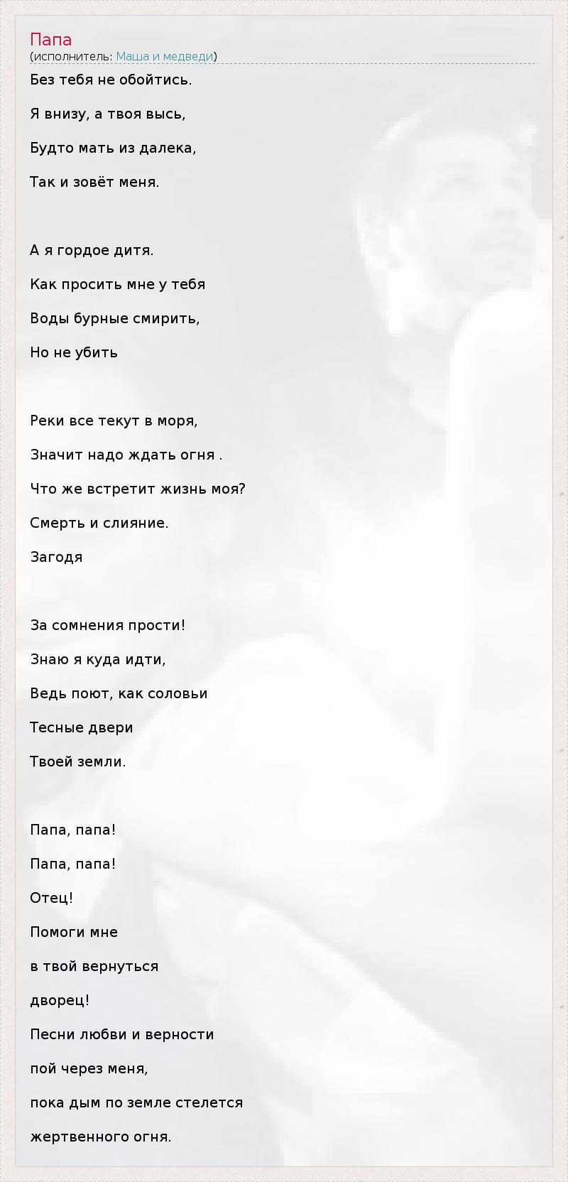 Без тебя не обойтись. Я внизу, а твоя высь, Будто мать из далека, Так и зовёт меня. А я гордое дитя. Как просить мне у тебя Воды бурные смирить, Но не убить Реки все текут в моря, Значит надо ждать огня . Что же встретит жизнь моя? Смерть и слияние. Загодя За сомнения прости! Знаю я куда идти, Ведь поют, как соловьи Тесные двери Твоей земли. Папа, папа! Папа, папа! Отец! Помоги мне в твой вернуться дворец! Песни любви и верности пой через меня, пока дым по земле стелется жертвенного огня.