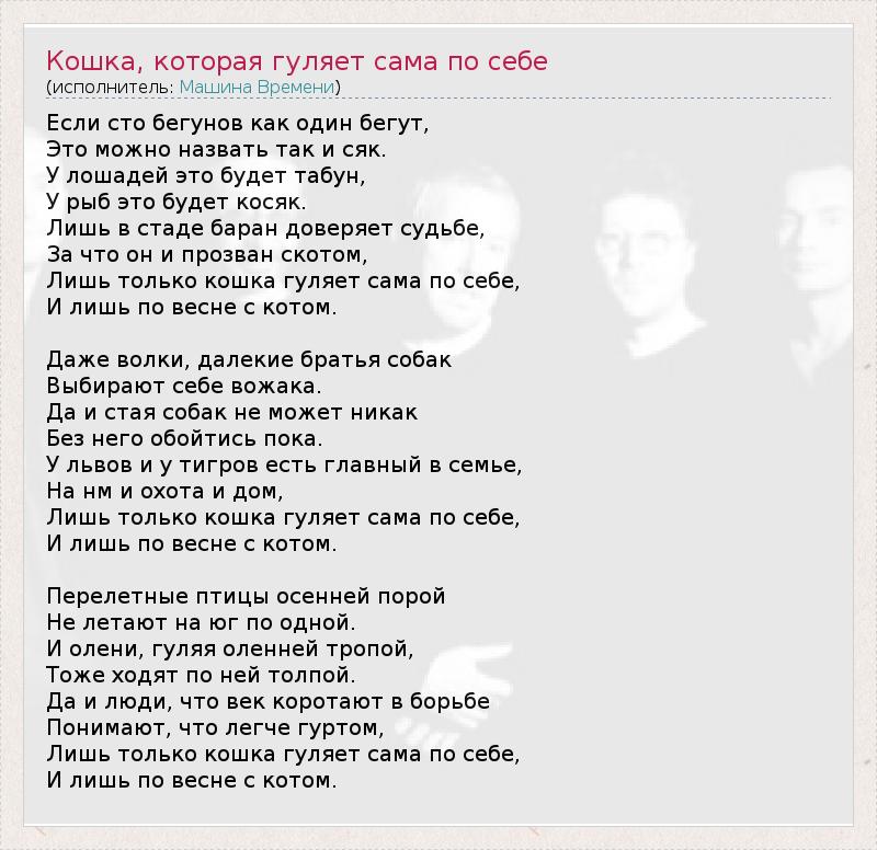 А как ты думаешь, о чем песня "Кошка, которая гуляет сама по себе" ?