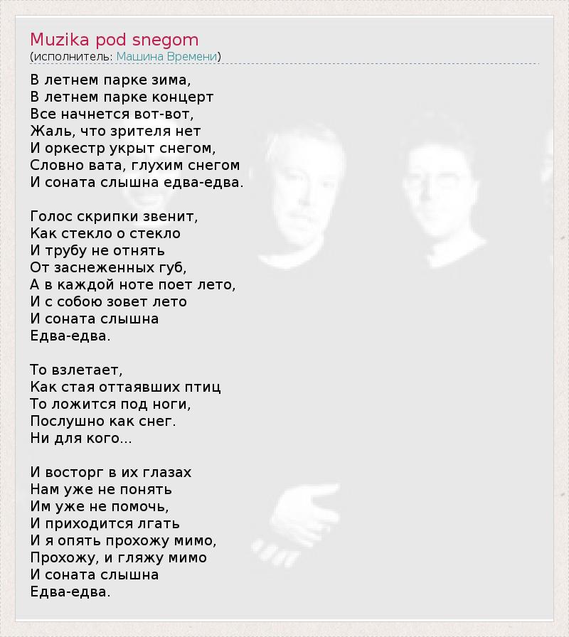 Это интересно:Москва - город государственный, и близость к наковальням власти преисполняла молодых искателей истины идти в официальные инстанции и убеждать эти инстанции, что играемая ими - молодыми - музыка нужна и полезна народу. Это забирало столько времени и сил, что собственно на писание песен сил уже оставалось не так много. Машина Времени - исключение. «Машина... продолжение