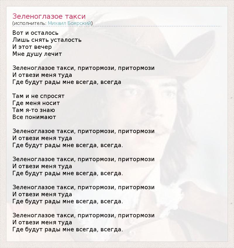 ГлавнаяИсполнителиМихаил БоярскийЗеленоглазое такси