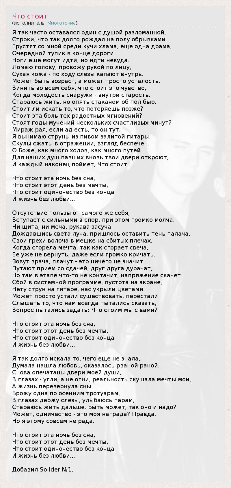 Я так долго оставался один с душой разломанной, Строки что долго рождал на полу обрывками. Грустят со мной среди кучи хлама, еще одна драма. Очередной тупик в конце дороги. Ноги еще могут идти, но идти некуда. Ломаю голову, провожу рукой по лицу, Сухая кожа - по ходу слезы капают внутрь. Может быть возраст, а может просто усталость. Винить во всем себя, что стоит это чувство, Когда молодость снаружи - внутри старость. Стараюсь жить, но опять стаканом о пол бьюсь. Стоит ли искать то, что потеряешь позже? Стоит ли эта боль тех радостных мгновений? Стоят ли годы мучений нескольких счастливых минут? Мираж рая, если ад есть, то он тут. Я понимаю струны из пивом залитой гитары. Скулы сжаты в отражении, взгляд беспечен. О Боже, как много ходов, как много путей, Для наших душ павших вновь твои двери откроют, И каждый наконец поймет, Что стоит... Что стоит эта ночь без сна, Что стоит этот день без мечты, Что стоит одиночество без конца И жизнь без любви... Отсутствие пользы от самого же себя, Вступая с сильными в спор, при этом громко молча. Ни щита, ни меча, рукава засуча. Дождавшись света луча, пришлось оставить тень палача. Свои грехи волоча в мешки на сбитых плечах. Когда сгорела мечта, так как сгорает свеча, Ее уже не вернуть, даже если громко крича. Зовут врача, плачут - это ничего не значит. Путают прием со сдачей, друг друга дурачат, Но там в этапе что-то не контачит, напряжение скачет. Сбой в системной программе, пустота на экране, Нету струн на гитаре, нас укрыли цветами. Может просто устали существовать, перестали Слышать то, что нам всегда пытались сказать, Вопрос пытались задать: Что стоим мы с вами? Что стоит эта ночь без сна, Что стоит этот день без мечты, Что стоит одиночество без конца И жизнь без любви... Я так долго искала то, чего еще не знала, Думала нашла любовь, оказалось рваной раной. Снова опечатаны двери моей души, В глазах - угли, а не огни, реальность скушала мечты мои, А жизнь перевернула сны. Брожу одна по осенним тротуарам, В глазах держу слезы, улыбаюсь парам, Стараюсь жить дальше. Быть может, так оно и надо? Может, одничество моя награда? Правда. Но я этому совсем не рада. Что стоит эта ночь без сна, Что стоит этот день без мечты, Что стоит одиночество без конца И жизнь без любви...