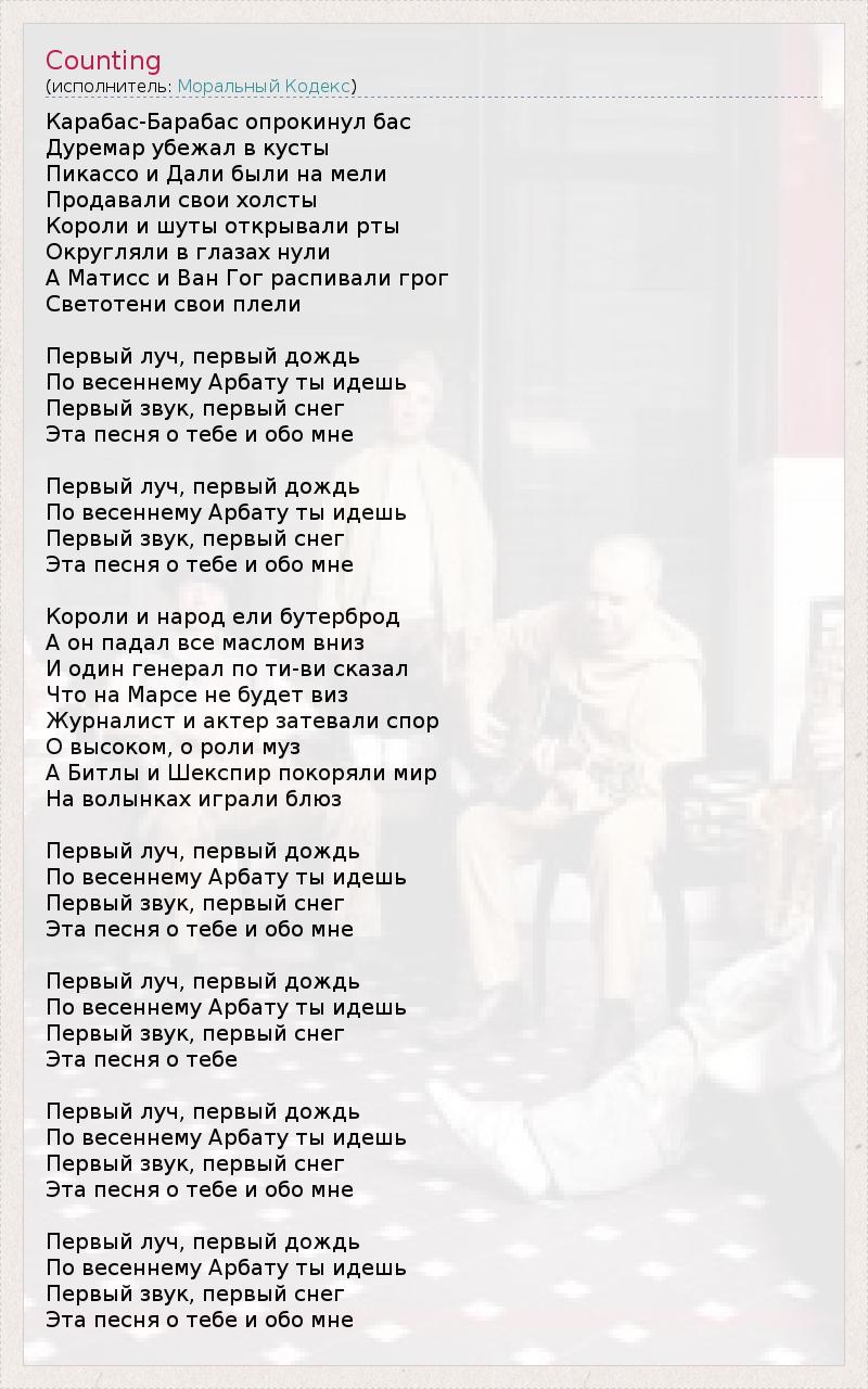 Карабас-Барабас опрокинул бас Дуремар убежал в кусты Пикассо и Дали были на мели Продавали свои холсты Короли и шуты открывали рты Округляли в глазах нули А Матисс и Ван Гог распивали грог Светотени свои плели Первый луч, первый дождь По весеннему Арбату ты идешь Первый звук, первый снег Эта песня о тебе и обо мне Первый луч, первый дождь По весеннему Арбату ты идешь Первый звук, первый снег Эта песня о тебе и обо мне Короли и народ ели бутерброд А он падал все маслом вниз И один генерал по ти-ви сказал Что на Марсе не будет виз Журналист и актер затевали спор О высоком, о роли муз А Битлы и Шекспир покоряли мир На волынках играли блюз Первый луч, первый дождь По весеннему Арбату ты идешь Первый звук, первый снег Эта песня о тебе и обо мне Первый луч, первый дождь По весеннему Арбату ты идешь Первый звук, первый снег Эта песня о тебе Первый луч, первый дождь По весеннему Арбату ты идешь Первый звук, первый снег Эта песня о тебе и обо мне Первый луч, первый дождь По весеннему Арбату ты идешь Первый звук, первый снег Эта песня о тебе и обо мне