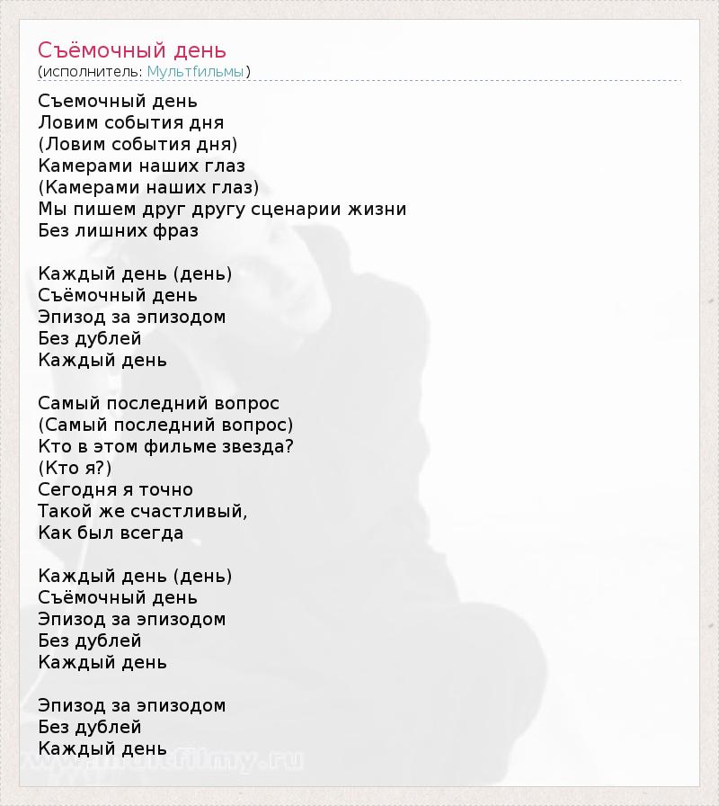 Съемочный день Ловим события дня (Ловим события дня) Камерами наших глаз (Камерами наших глаз) Мы пишем друг другу сценарии жизни Без лишних фраз Каждый день (день) Съёмочный день Эпизод за эпизодом Без дублей Каждый день Самый последний вопрос (Самый последний вопрос) Кто в этом фильме звезда? (Кто я?) Сегодня я точно Такой же счастливый, Как был всегда Каждый день (день) Съёмочный день Эпизод за эпизодом Без дублей Каждый день Эпизод за эпизодом Без дублей Каждый день