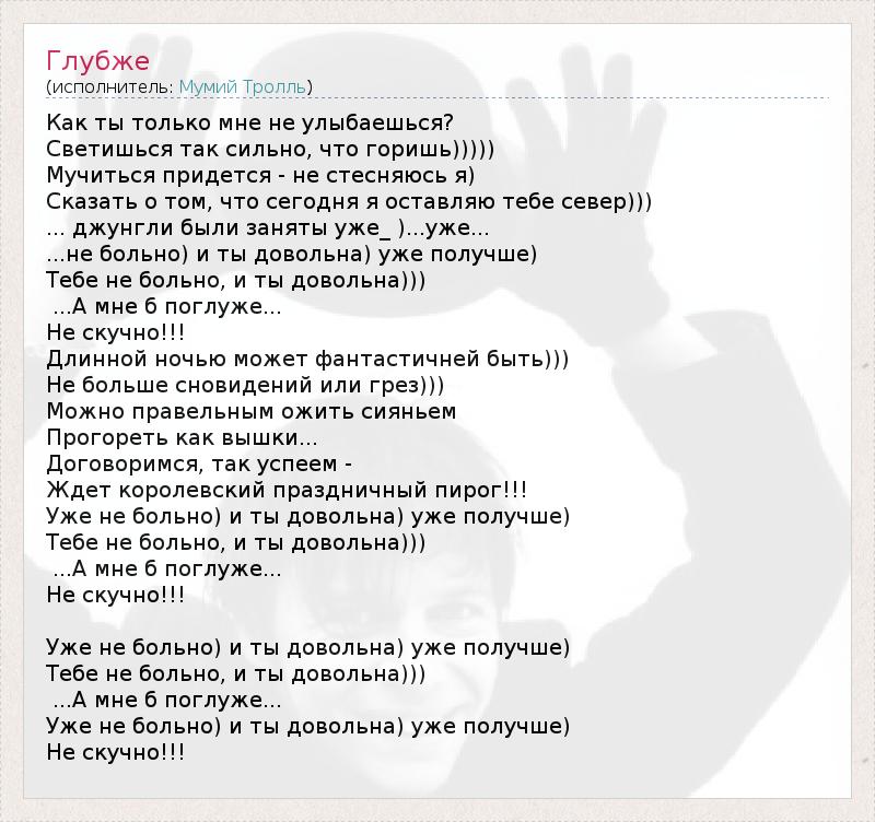 Как ты только мне не улыбаешься? Светишься так сильно, что горишь))))) Мучиться придется - не стесняюсь я) Сказать о том, что сегодня я оставляю тебе север))) ... джунгли были заняты уже_ )...уже... ...не больно) и ты довольна) уже получше) Тебе не больно, и ты довольна))) ...А мне б поглуже... Не скучно!!! Длинной ночью может фантастичней быть))) Не больше сновидений или грез))) Можно правельным ожить сияньем Прогореть как вышки... Договоримся, так успеем - Ждет королевский праздничный пирог!!! Уже не больно) и ты довольна) уже получше) Тебе не больно, и ты довольна))) ...А мне б поглуже... Не скучно!!! Уже не больно) и ты довольна) уже получше) Тебе не больно, и ты довольна))) ...А мне б поглуже... Уже не больно) и ты довольна) уже получше) Не скучно!!!