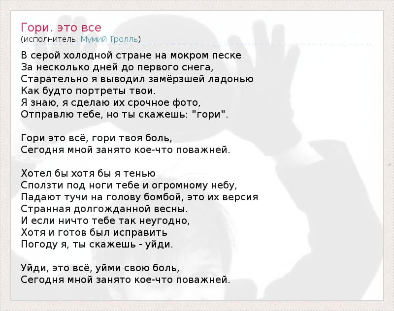 В серой холодной стране на мокром песке За несколько дней до первого снега, Старательно я выводил замёрзшей ладонью Как будто портреты твои. Я знаю, я сделаю их срочное фото, Отправлю тебе, но ты скажешь: "гори". Гори это всё, гори твоя боль, Сегодня мной занято кое-что поважней. Хотел бы хотя бы я тенью Сползти под ноги тебе и огромному небу, Падают тучи на голову бомбой, это их версия Странная долгожданной весны. И если ничто тебе так неугодно, Хотя и готов был исправить Погоду я, ты скажешь - уйди. Уйди, это всё, уйми свою боль, Сегодня мной занято кое-что поважней.