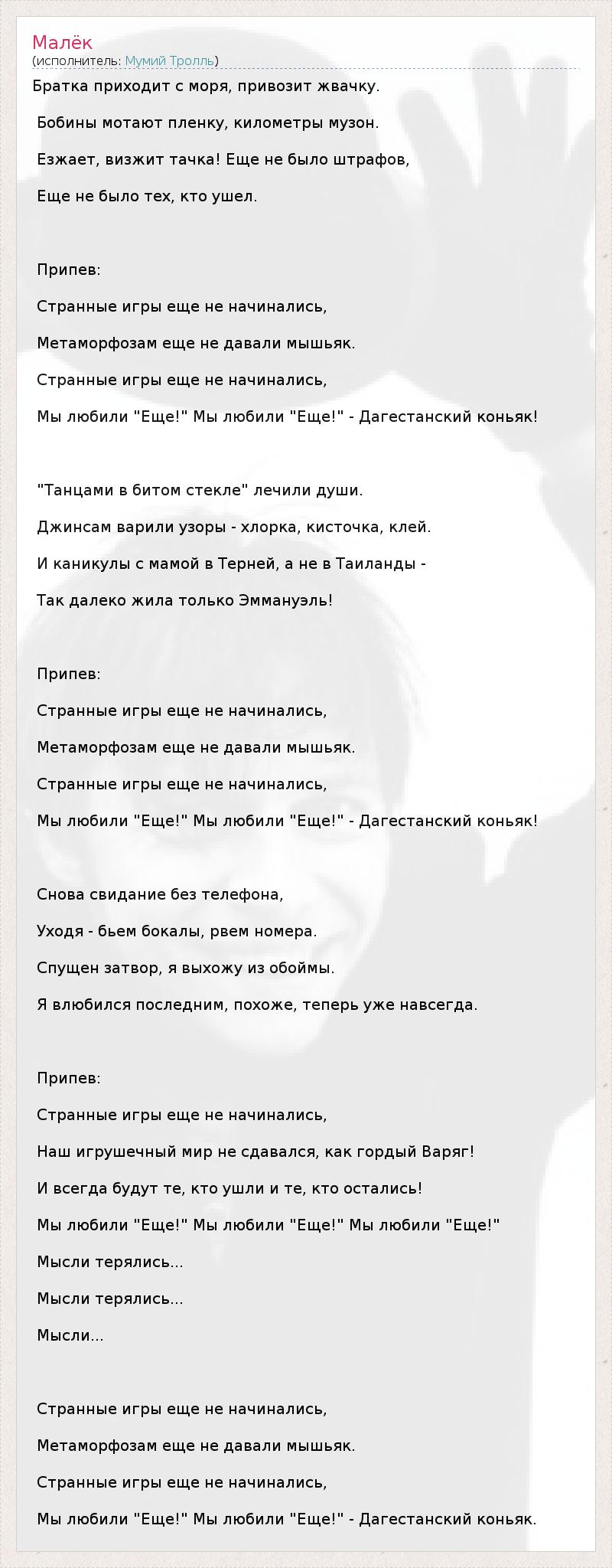 Братка приходит с моря, привозит жвачку. Бобины мотают пленку, километры музон. Езжает, визжит тачка! Еще не было штрафов, Еще не было тех, кто ушел. Припев: Странные игры еще не начинались, Метаморфозам еще не давали мышьяк. Странные игры еще не начинались, Мы любили "Еще!" Мы любили "Еще!" - Дагестанский коньяк! "Танцами в битом стекле" лечили души. Джинсам варили узоры - хлорка, кисточка, клей. И каникулы с мамой в Терней, а не в Таиланды - Так далеко жила только Эммануэль! Припев: Странные игры еще не начинались, Метаморфозам еще не давали мышьяк. Странные игры еще не начинались, Мы любили "Еще!" Мы любили "Еще!" - Дагестанский коньяк! Снова свидание без телефона, Уходя - бьем бокалы, рвем номера. Спущен затвор, я выхожу из обоймы. Я влюбился последним, похоже, теперь уже навсегда. Припев: Странные игры еще не начинались, Наш игрушечный мир не сдавался, как гордый Варяг! И всегда будут те, кто ушли и те, кто остались! Мы любили "Еще!" Мы любили "Еще!" Мы любили "Еще!" Мысли терялись... Мысли терялись... Мысли... Странные игры еще не начинались, Метаморфозам еще не давали мышьяк. Странные игры еще не начинались, Мы любили "Еще!" Мы любили "Еще!" - Дагестанский коньяк.
