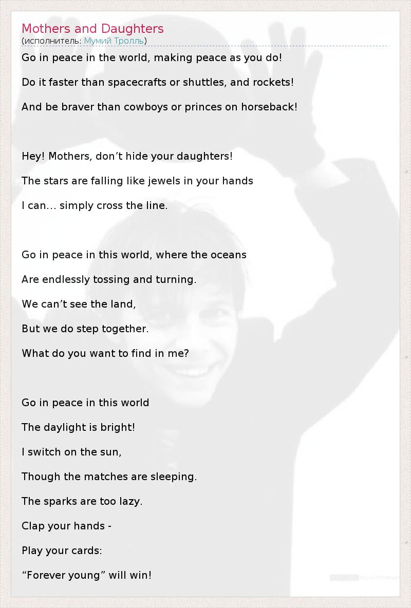 А как ты думаешь, о чем песня "Mothers and Daughters" ?