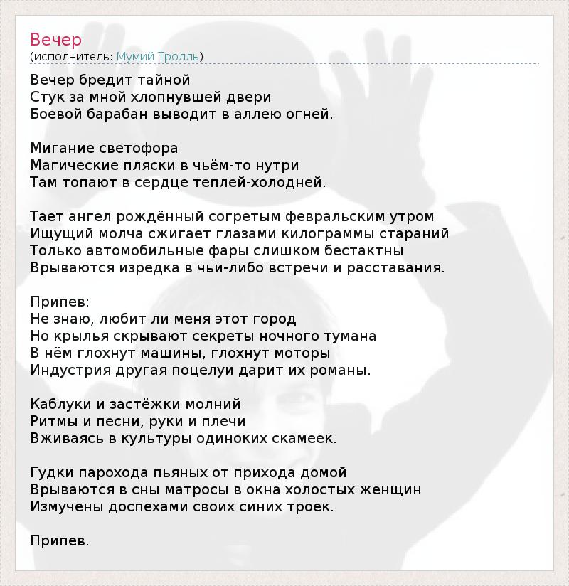 Вечер бредит тайной Стук за мной хлопнувшей двери Боевой барабан выводит в аллею огней. Мигание светофора Магические пляски в чьём-то нутри Там топают в сердце теплей-холодней. Тает ангел рождённый согретым февральским утром Ищущий молча сжигает глазами килограммы стараний Только автомобильные фары слишком бестактны Врываются изредка в чьи-либо встречи и расставания. Припев: Не знаю, любит ли меня этот город Но крылья скрывают секреты ночного тумана В нём глохнут машины, глохнут моторы Индустрия другая поцелуи дарит их романы. Каблуки и застёжки молний Ритмы и песни, руки и плечи Вживаясь в культуры одиноких скамеек. Гудки парохода пьяных от прихода домой Врываются в сны матросы в окна холостых женщин Измучены доспехами своих синих троек. Припев.