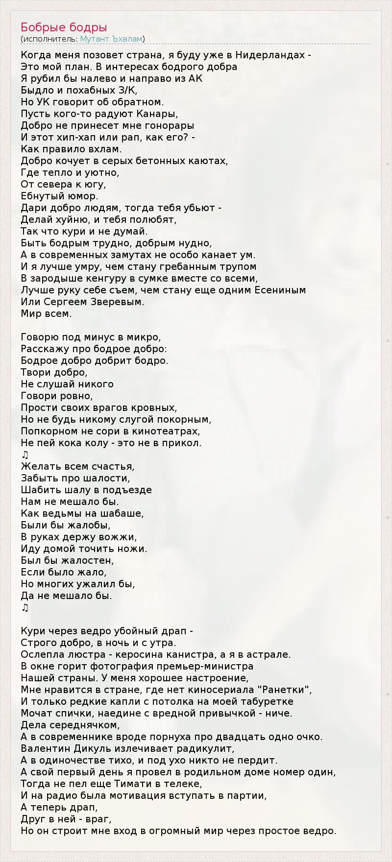 Это интересно:Мутант Ъхвлам это experimental hip-hop коллектив, мутировавший в подземельях славного города Магнитогорска, где рэп разлагается и гниет в дешевых клубах с незапамятных 90-х.На творчество коллектива повлияли ветра с Магнитогорского Металлургического Комбината, а также интоксикация высокоинтеллектуальных участников коллектива.www.vk.com/mootant - кружок шизофреников-куплетистовДискография:... продолжение