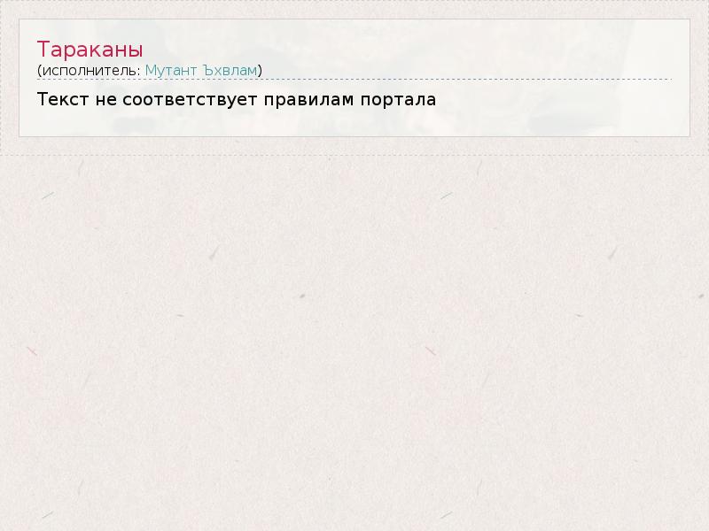 All in the mind cockroaches, yesterday I vomit in the bathroom Today, marijuana Carmen, pants, jeans Outside, on the balcony, in trousers, in packages On the streets of thieves Right growth - Cosa Nostra Hawaiian Rose - it's just a set of words Word comes Dreamcatcher, based on fundamentals Lies mathematics, physics, chemistry The boys run all of them are bad, they have kidnapped And still, still waters run leading So they say in my country There, each fly or carting manure beetle beetle This I know, my grandmother onion fries On the streets of unrest nischita, fights Sleep alcoholics, gay marriage, democracy .. Democracy is the rule! Cockroach, cockroach, cockroach He growls and bastard. And it kills. And roars bastard. And it kills. Velvet Poster Parade Baran on watch, cockroaches in elevator And siphon the wine, buy elite seeds kanapli And wipe the snot on the nozzle bar, owls do not need sleep Mason need a suitcase for the peso and a mustache, he vdavets Nifigovy swimmer as Jacques Cousteau We are not just rushing sour, people in the world disasters Shit happens, but now space on the distance of an elongated finger I am drawn to her pollen, I soar chanson and pop For breakfast, chocolate and sausages Without losing speed, passing Napas August Vyras on caste, here is my knuckles, noise from old cassettes Flooded all the world and opopsel op and settled on the wall 7 Say I isleduetsya your accepted Swimming pool, but availability Anamaliya, Hussein is not guilty We are still in the basement, in the wood afloat No radio wave, no cable, no do not give a drop Not you and not me. Roth animel. Cockroaches mutilated before, behind the sink smolder And maybe there is a paradise on earth, a phenomenon that haunts me Every day killed plants and to fuck we do it Though tattered control departments, addicted herbs Like (?) Will be a lot of corpses But cockroaches and survive a nuclear war is not difficult Return to Paradise ruins, Putin backyard ant Their names are engraved on the graves, before the Olympic Games won But ural sleep at this time, but the cheers would give Aligafreny visit the parks in the morning, slamming his mouth as the Pacman In vaakumnyh layers telescreen, resins cockroaches Georgia is, it's not a smart look Colleges in the stroller easy, thought is not far from the truth Cockroaches gnaw, grizzly ... Dima ... Grizzly chewed and eaten. Cockroach, cockroach, cockroach He growls and bastard. And it kills. And roars bastard. And it kills.