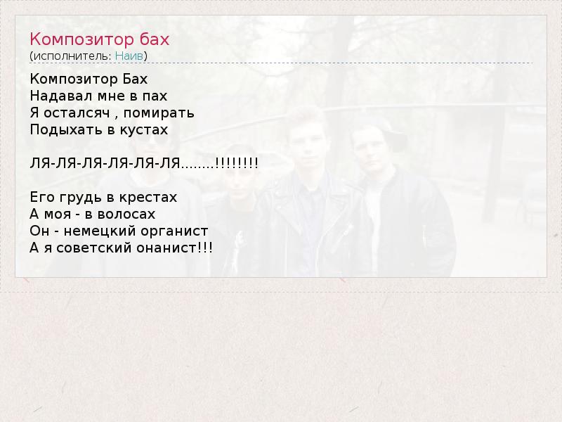 Композитор Бах Надавал мне в пах Я осталсяч , помирать Подыхать в кустах ЛЯ-ЛЯ-ЛЯ-ЛЯ-ЛЯ-ЛЯ........!!!!!!!! Его грудь в крестах А моя - в волосах Он - немецкий органист А я советский онанист!!!