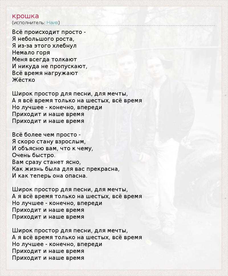 Всё происходит просто - Я небольшого роста, Я из-за этого хлебнул Немало горя Меня всегда толкают И никуда не пропускают, Всё время нагружают Жёстко Широк простор для песни, для мечты, А я всё время только на шестых, всё время Но лучшее - конечно, впереди Приходит и наше время Приходит и наше время Всё более чем просто - Я скоро стану взрослым, И объясню вам, что к чему, Очень быстро. Вам сразу станет ясно, Как жизнь была для вас прекрасна, И как теперь она опасна. Широк простор для песни, для мечты, А я всё время только на шестых, всё время Но лучшее - конечно, впереди Приходит и наше время Приходит и наше время Широк простор для песни, для мечты, А я всё время только на шестых, всё время Но лучшее - конечно, впереди Приходит и наше время Приходит и наше время