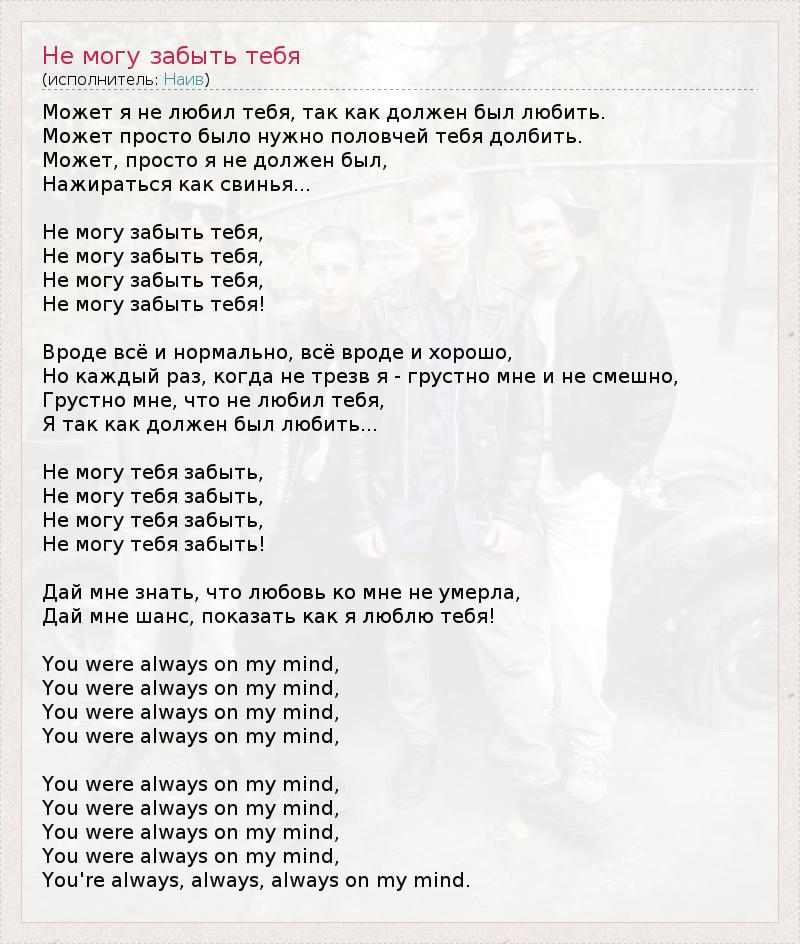 Может я не любил тебя, так как должен был любить. Может просто было нужно половчей тебя долбить. Может, просто я не должен был, Нажираться как свинья... Не могу забыть тебя, Не могу забыть тебя, Не могу забыть тебя, Не могу забыть тебя! Вроде всё и нормально, всё вроде и хорошо, Но каждый раз, когда не трезв я - грустно мне и не смешно, Грустно мне, что не любил тебя, Я так как должен был любить... Не могу тебя забыть, Не могу тебя забыть, Не могу тебя забыть, Не могу тебя забыть! Дай мне знать, что любовь ко мне не умерла, Дай мне шанс, показать как я люблю тебя! You were always on my mind, You were always on my mind, You were always on my mind, You were always on my mind, You were always on my mind, You were always on my mind, You were always on my mind, You were always on my mind, You're always, always, always on my mind.