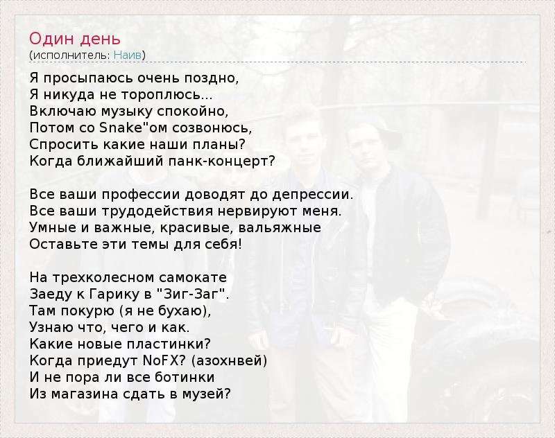 Это интересно:Группа Наив была основана осенью 1988 году в Вооружённых Силах СССР двумя рекрутами Максимом Кочетковым и Сашей Ивановым (RadioЧаЧа), что для панк-коллектива весьма не естественно. Группа Наив родом из города Москва. В следующем году — начало гражданского периода в развитии группы: НАИВ входит в состав Московской Рок-Лаборатории, а уже в 1990 году НАИВ выпускает... продолжение