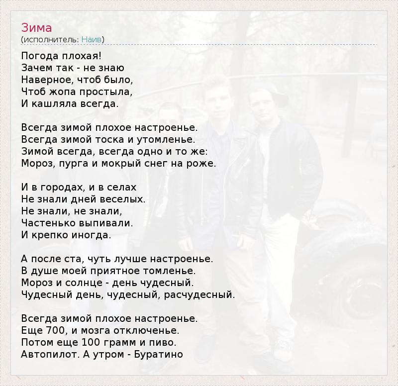Это интересно:Группа Наив была основана осенью 1988 году в Вооружённых Силах СССР двумя рекрутами Максимом Кочетковым и Сашей Ивановым (RadioЧаЧа), что для панк-коллектива весьма не естественно. Группа Наив родом из города Москва. В следующем году — начало гражданского периода в развитии группы: НАИВ входит в состав Московской Рок-Лаборатории, а уже в 1990 году НАИВ выпускает... продолжение