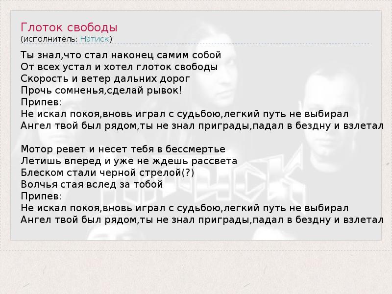 Натиск - Глоток свободы http://megalyrics.ru/lyric/%D0%BD%D0%B0%D1%82%D0%B8%D1%81%D0%BA/%D0%B3%D0%BB%D0%BE%D1%82%D0%BE%D0%BA-%D1%81%D0%B2%D0%BE%D0%B1%D0%BE%D0%B4%D1%8B.htm#ixzz23tioaKdm