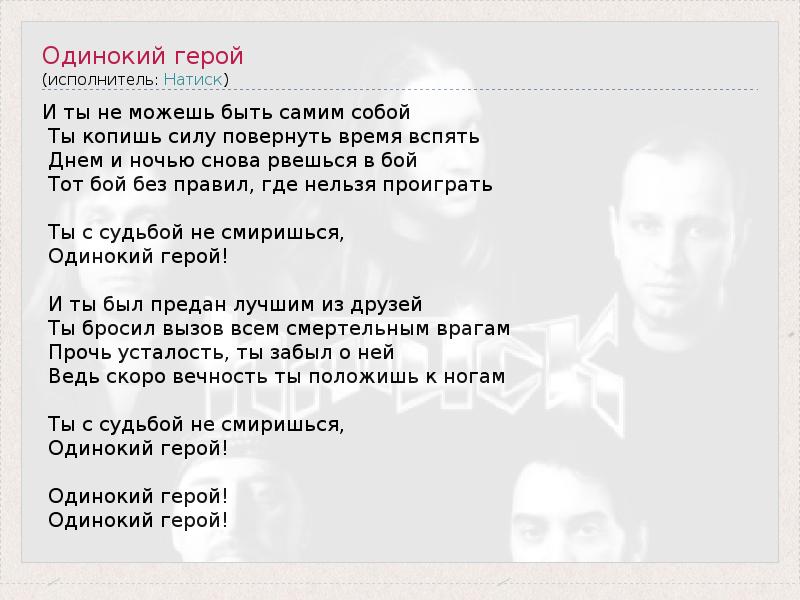 И ты не можешь быть самим собой Ты копишь силу повернуть время вспять Днем и ночью снова рвешься в бой Тот бой без правил, где нельзя проиграть Ты с судьбой не смиришься, Одинокий герой! И ты был предан лучшим из друзей Ты бросил вызов всем смертельным врагам Прочь усталость, ты забыл о ней Ведь скоро вечность ты положишь к ногам Ты с судьбой не смиришься, Одинокий герой! Одинокий герой! Одинокий герой! Натиск - Одинокий герой http://megalyrics.ru/lyric/%D0%BD%D0%B0%D1%82%D0%B8%D1%81%D0%BA/%D0%BE%D0%B4%D0%B8%D0%BD%D0%BE%D0%BA%D0%B8%D0%B9-%D0%B3%D0%B5%D1%80%D0%BE%D0%B9.htm#ixzz23tjqnZqG