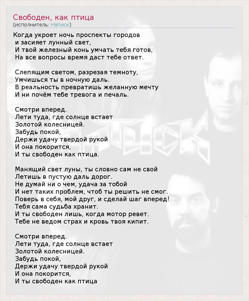 Натиск - Свободен, как птица http://megalyrics.ru/lyric/%D0%BD%D0%B0%D1%82%D0%B8%D1%81%D0%BA/%D1%81%D0%B2%D0%BE%D0%B1%D0%BE%D0%B4%D0%B5%D0%BD-%D0%BA%D0%B0%D0%BA-%D0%BF%D1%82%D0%B8%D1%86%D0%B0.htm#ixzz23tj6yOTw