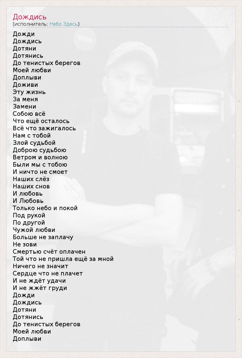 Дожди Дождись Дотяни Дотянись До тенистых берегов Моей любви Доплыви Доживи Эту жизнь За меня Замени Собою всё Что ещё осталось Всё что зажигалось Нам с тобой Злой судьбой Доброю судьбою Ветром и волною Были мы с тобою И ничто не смоет Наших слёз Наших снов И любовь И Любовь Только небо и покой Под рукой По другой Чужой любви Больше не заплачу Не зови Смертью счёт оплачен Той что не пришла ещё за мной Ничего не значит Сердце что не плачет И не ждёт удачи И не жжёт груди Дожди Дождись Дотяни Дотянись До тенистых берегов Моей любви Доплыви