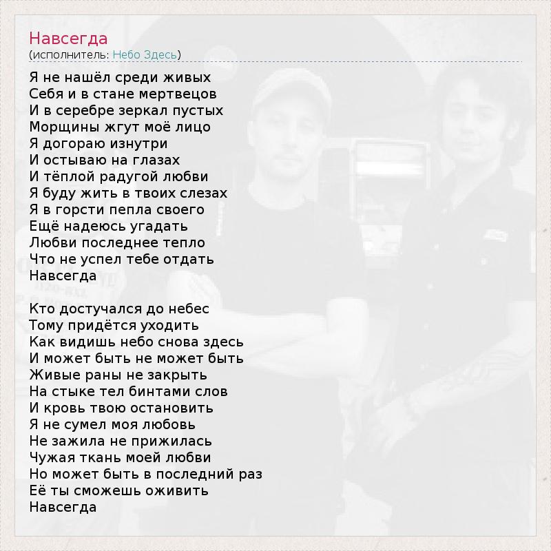 Это интересно:"Небо здесь" - российская независимая рок-группа, появившаяся в начале 1990-х годов под названием "Team ocean". В конце 1990-х вместе с новым названием группа обрела известность, доступ к самым большим концертным площадкам, поддержку MTV и других музыкальных СМИ и заключила контракт с одной из крупнейших российских музыкальных компаний. Помимо крупнейших российских музыкальных фестивалей... продолжение