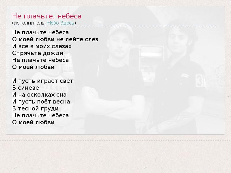 Не плачьте небеса О моей любви не лейте слёз И все в моих слезах Спрячьте дожди Не плачьте небеса О моей любви И пусть играет свет В синеве И на осколках сна И пусть поёт весна В тесной груди Не плачьте небеса О моей любви