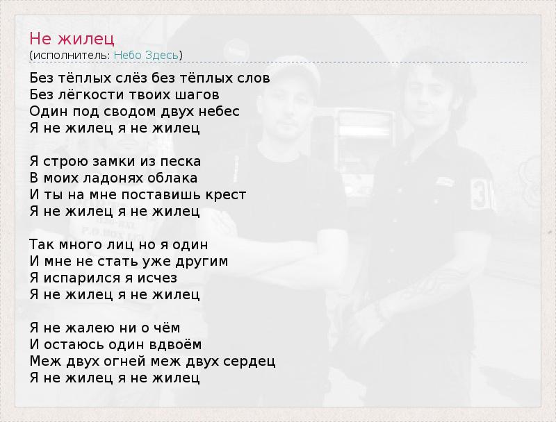 Это интересно:"Небо здесь" - российская независимая рок-группа, появившаяся в начале 1990-х годов под названием "Team ocean". В конце 1990-х вместе с новым названием группа обрела известность, доступ к самым большим концертным площадкам, поддержку MTV и других музыкальных СМИ и заключила контракт с одной из крупнейших российских музыкальных компаний. Помимо крупнейших российских музыкальных фестивалей... продолжение