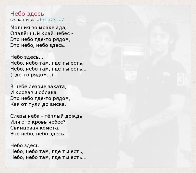 Это интересно:"Небо здесь" - российская независимая рок-группа, появившаяся в начале 1990-х годов под названием "Team ocean". В конце 1990-х вместе с новым названием группа обрела известность, доступ к самым большим концертным площадкам, поддержку MTV и других музыкальных СМИ и заключила контракт с одной из крупнейших российских музыкальных компаний. Помимо крупнейших российских музыкальных фестивалей... продолжение