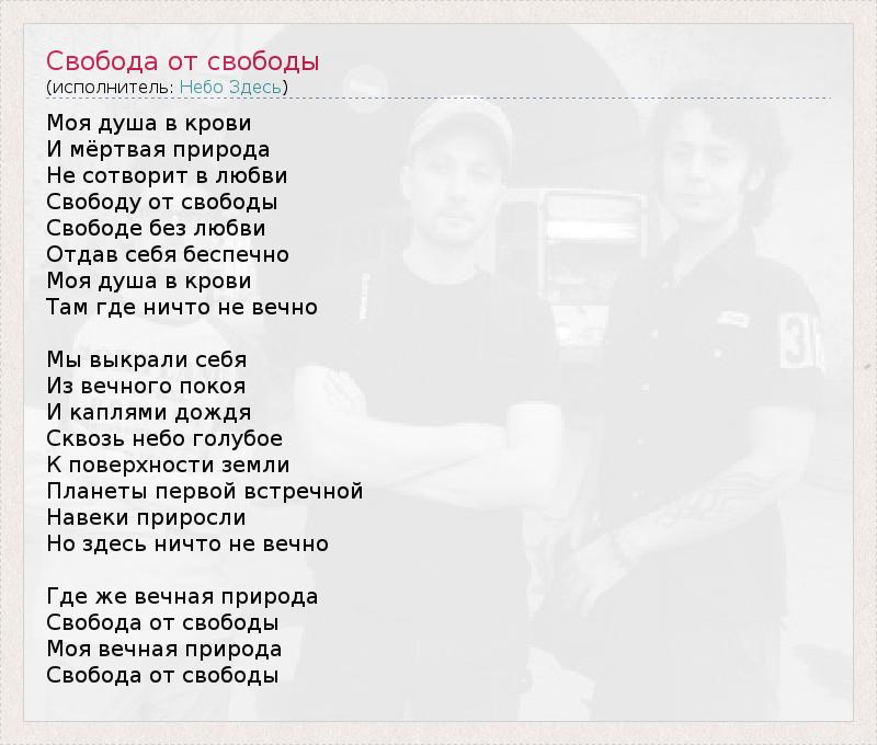 Моя душа в крови И мёртвая природа Не сотворит в любви Свободу от свободы Свободе без любви Отдав себя беспечно Моя душа в крови Там где ничто не вечно Мы выкрали себя Из вечного покоя И каплями дождя Сквозь небо голубое К поверхности земли Планеты первой встречной Навеки приросли Но здесь ничто не вечно Где же вечная природа Свобода от свободы Моя вечная природа Свобода от свободы