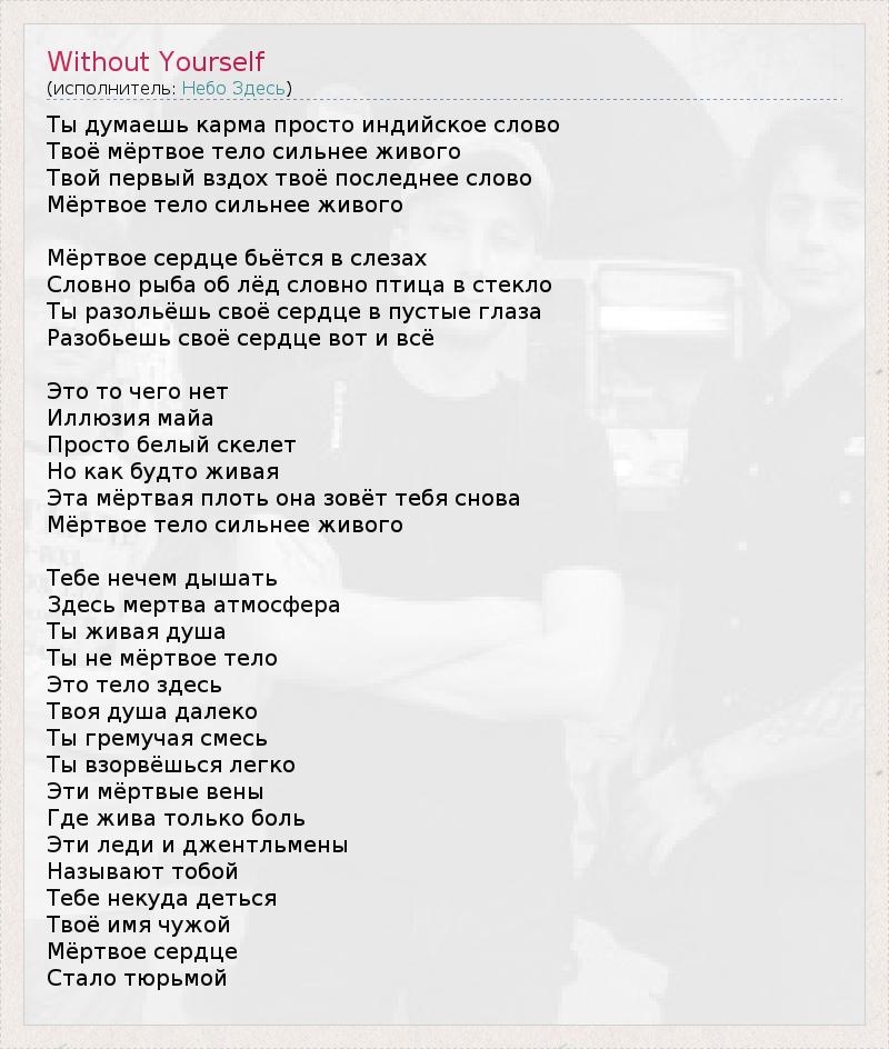 Ты думаешь карма просто индийское слово Твоё мёртвое тело сильнее живого Твой первый вздох твоё последнее слово Мёртвое тело сильнее живого Мёртвое сердце бьётся в слезах Словно рыба об лёд словно птица в стекло Ты разольёшь своё сердце в пустые глаза Разобьешь своё сердце вот и всё Это то чего нет Иллюзия майа Просто белый скелет Но как будто живая Эта мёртвая плоть она зовёт тебя снова Мёртвое тело сильнее живого Тебе нечем дышать Здесь мертва атмосфера Ты живая душа Ты не мёртвое тело Это тело здесь Твоя душа далеко Ты гремучая смесь Ты взорвёшься легко Эти мёртвые вены Где жива только боль Эти леди и джентльмены Называют тобой Тебе некуда деться Твоё имя чужой Мёртвое сердце Стало тюрьмой