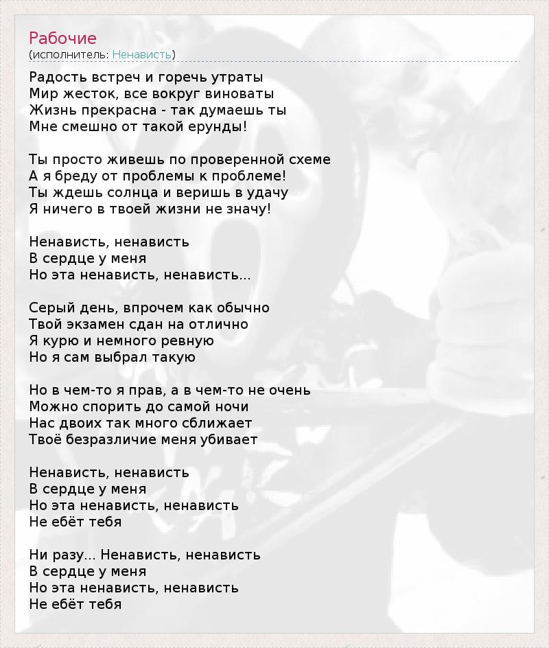 Радость встреч и горечь утраты Мир жесток, все вокруг виноваты Жизнь прекрасна - так думаешь ты Мне смешно от такой ерунды! Ты просто живешь по проверенной схеме А я бреду от проблемы к проблеме! Ты ждешь солнца и веришь в удачу Я ничего в твоей жизни не значу! Ненависть, ненависть В сердце у меня Но эта ненависть, ненависть... Серый день, впрочем как обычно Твой экзамен сдан на отлично Я курю и немного ревную Но я сам выбрал такую Но в чем-то я прав, а в чем-то не очень Можно спорить до самой ночи Нас двоих так много сближает Твоё безразличие меня убивает Ненависть, ненависть В сердце у меня Но эта ненависть, ненависть Не ебёт тебя Ни разу... Ненависть, ненависть В сердце у меня Но эта ненависть, ненависть Не ебёт тебя