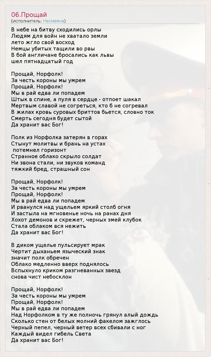 В небе на битву сходились орлы Людям для войн не хватало земли лето жгло свой восход Немцы убитых тащили во рвы В бой англичане бросались как львы шел пятнадцатый год Прощай, Норфолк! За честь короны мы умрем Прощай, Норфолк! Мы в рай едва ли попадем Штык в спине, а пуля в сердце - отпоет шакал Мертвым славой не согреться, кто б не согревал В жилах кровь суровых бриттов бьется, словно ток Смерть сегодня будет сытой Да хранит вас Бог! Полк из Норфолка затерян в горах Стынут молитвы и брань на устах потемнел горизонт Странное облако скрыло солдат Ни звона стали, ни звуков команд тяжкий бред, страшный сон Прощай, Норфолк! За честь короны мы умрем Прощай, Норфолк! Мы в рай едва ли попадем И рванулся над ущельем яркий столб огня И застыла на мгновенье ночь на ранах дня Хохот демонов и скрежет, черных змей клубок Стала облаком вся нежить Да хранит вас Бог! В диком ущелье пульсирует мрак Чертит дыханьем языческий знак значит полк обречен Облако медленно вверх поднялось Вспыхнуло криком разгневанных звезд снова чист небосклон Прощай, Норфолк! За честь короны мы умрем Прощай, Норфолк! Мы в рай едва ли попадем Над Норфолком в ту же полночь грянул алый дождь Сколько стен от белых молний факелом зажглось Черный пепел, черный ветер всех сбивали с ног Каждый видел гибель Света Да хранит вас Бог!