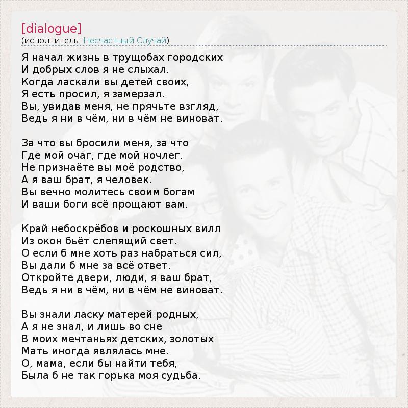 Я начал жизнь в трущобах городских И добрых слов я не слыхал. Когда ласкали вы детей своих, Я есть просил, я замерзал. Вы, увидав меня, не прячьте взгляд, Ведь я ни в чём, ни в чём не виноват. За что вы бросили меня, за что Где мой очаг, где мой ночлег. Не признаёте вы моё родство, А я ваш брат, я человек. Вы вечно молитесь своим богам И ваши боги всё прощают вам. Край небоскрёбов и роскошных вилл Из окон бьёт слепящий свет. О если б мне хоть раз набраться сил, Вы дали б мне за всё ответ. Откройте двери, люди, я ваш брат, Ведь я ни в чём, ни в чём не виноват. Вы знали ласку матерей родных, А я не знал, и лишь во сне В моих мечтаньях детских, золотых Мать иногда являлась мне. О, мама, если бы найти тебя, Была б не так горька моя судьба.