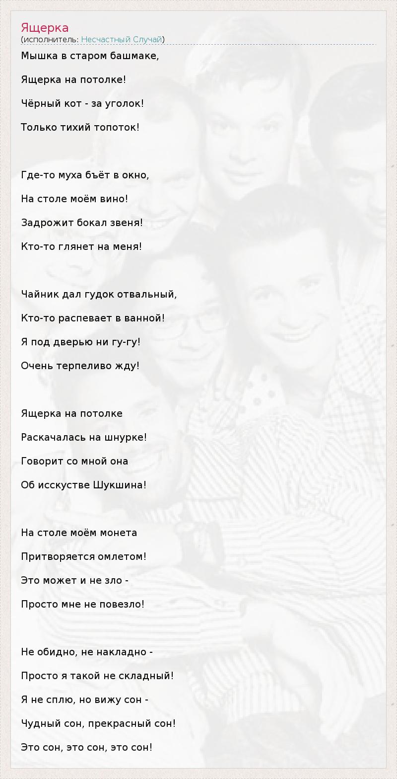Это интересно:Источник информации: Официальная страница www.ns.ruДата рождения - 13 сентября 1983 годаВозраст - вокруг тридцатиОбразование - очень высшее и не очень музыкальноеБоевой клич - Приходи Гармония, Гармония приходи!Наш день - пятница 13-еКоманда "Несчастный Случай" как отдельная музыкальная единица была сформирована в 1983 году студентами МГУ Алексеем... продолжение