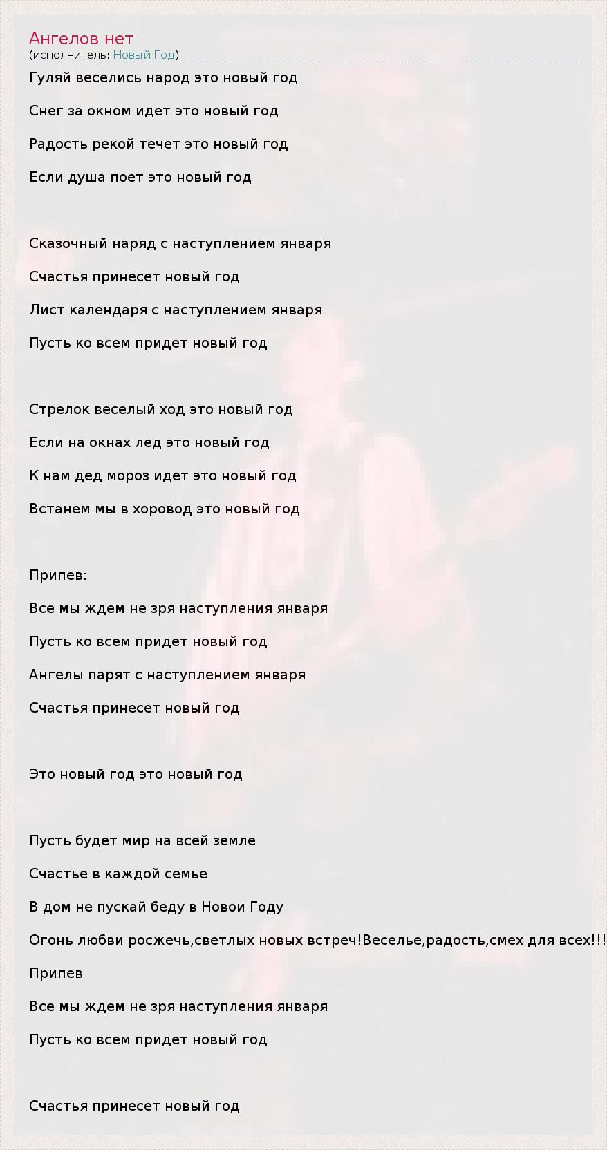 Гуляй веселись народ это новый год Снег за окном идет это новый год Радость рекой течет это новый год Если душа поет это новый год Сказочный наряд с наступлением января Счастья принесет новый год Лист календаря с наступлением января Пусть ко всем придет новый год Стрелок веселый ход это новый год Если на окнах лед это новый год К нам дед мороз идет это новый год Встанем мы в хоровод это новый год Припев: Все мы ждем не зря наступления января Пусть ко всем придет новый год Ангелы парят с наступлением января Счастья принесет новый год Это новый год это новый год Пусть будет мир на всей земле Счастье в каждой семье В дом не пускай беду в Новои Году Огонь любви росжечь,светлых новых встреч!Веселье,радость,смех для всех!!! Припев Все мы ждем не зря наступления января Пусть ко всем придет новый год Счастья принесет новый год