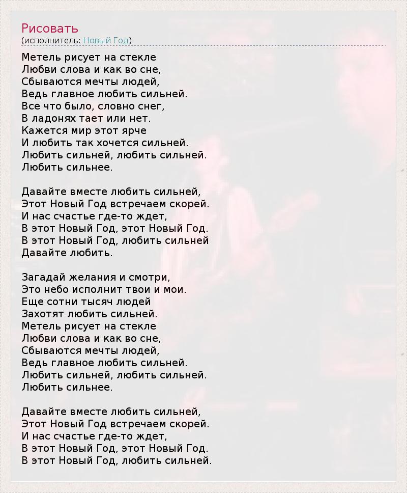 Метель рисует на стекле Любви слова и как во сне, Сбываются мечты людей, Ведь главное любить сильней. Все что было, словно снег, В ладонях тает или нет. Кажется мир этот ярче И любить так хочется сильней. Любить сильней, любить сильней. Любить сильнее. Давайте вместе любить сильней, Этот Новый Год встречаем скорей. И нас счастье где-то ждет, В этот Новый Год, этот Новый Год. В этот Новый Год, любить сильней Давайте любить. Загадай желания и смотри, Это небо исполнит твои и мои. Еще сотни тысяч людей Захотят любить сильней. Метель рисует на стекле Любви слова и как во сне, Сбываются мечты людей, Ведь главное любить сильней. Любить сильней, любить сильней. Любить сильнее. Давайте вместе любить сильней, Этот Новый Год встречаем скорей. И нас счастье где-то ждет, В этот Новый Год, этот Новый Год. В этот Новый Год, любить сильней.