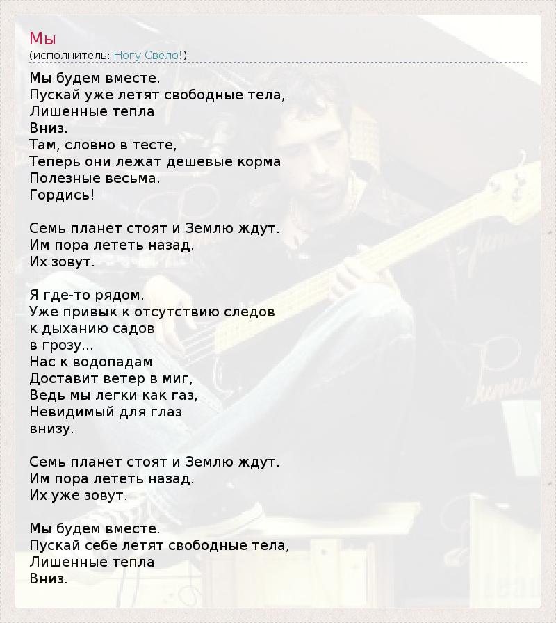 Ногу Свело! - Идем на Восток! http://megalyrics.ru/lyric/%D0%BD%D0%BE%D0%B3%D1%83-%D1%81%D0%B2%D0%B5%D0%BB%D0%BE/%D0%B8%D0%B4%D0%B5%D0%BC-%D0%BD%D0%B0-%D0%B2%D0%BE%D1%81%D1%82%D0%BE%D0%BA.htm#ixzz2A8nQOgqR