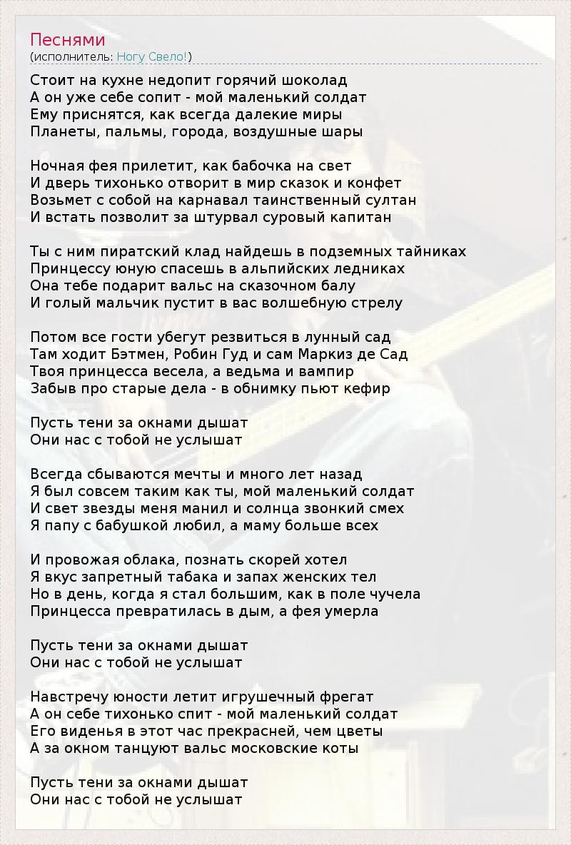 Ногу Свело! - Идем на Восток! http://megalyrics.ru/lyric/%D0%BD%D0%BE%D0%B3%D1%83-%D1%81%D0%B2%D0%B5%D0%BB%D0%BE/%D0%B8%D0%B4%D0%B5%D0%BC-%D0%BD%D0%B0-%D0%B2%D0%BE%D1%81%D1%82%D0%BE%D0%BA.htm#ixzz2A8nQOgqR