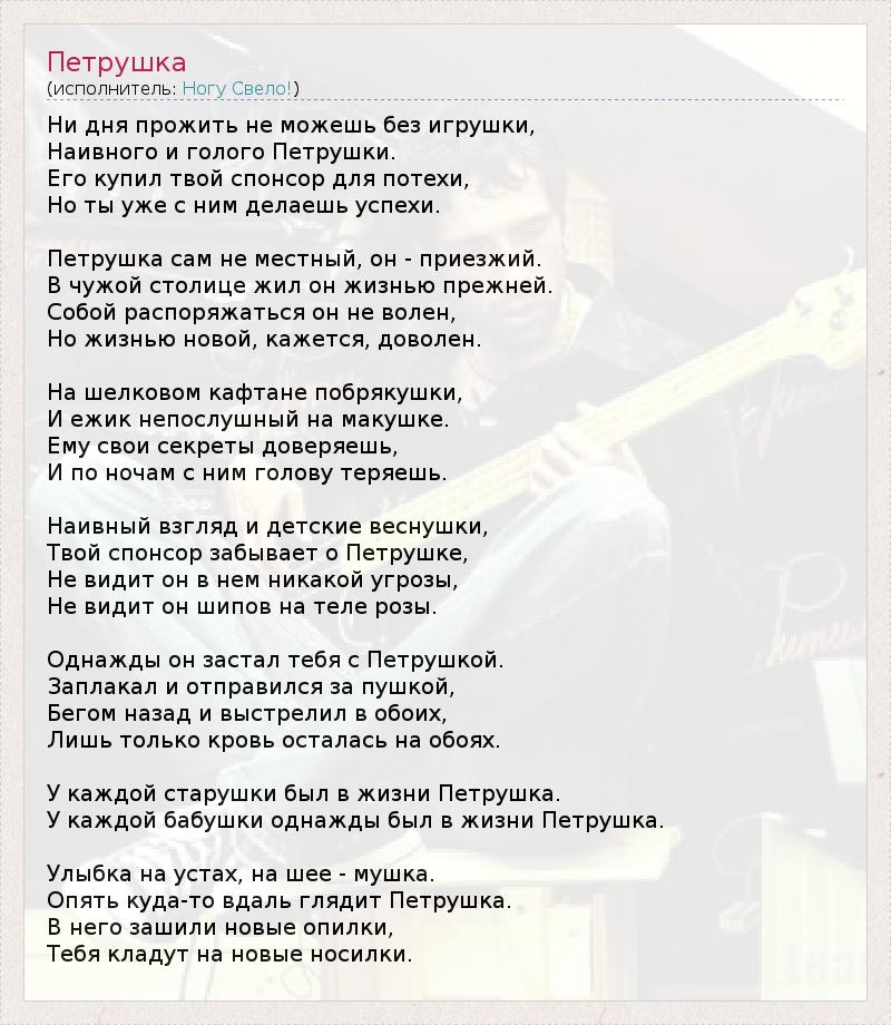 Ни дня прожить не можешь без игрушки, Наивного и голого Петрушки. Его купил твой спонсор для потехи, Но ты уже с ним делаешь успехи. Петрушка сам не местный, он - приезжий. В чужой столице жил он жизнью прежней. Собой распоряжаться он не волен, Но жизнью новой, кажется, доволен. На шелковом кафтане побрякушки, И ежик непослушный на макушке. Ему свои секреты доверяешь, И по ночам с ним голову теряешь. Наивный взгляд и детские веснушки, Твой спонсор забывает о Петрушке, Не видит он в нем никакой угрозы, Не видит он шипов на теле розы. Однажды он застал тебя с Петрушкой. Заплакал и отправился за пушкой, Бегом назад и выстрелил в обоих, Лишь только кровь осталась на обоях. У каждой старушки был в жизни Петрушка. У каждой бабушки однажды был в жизни Петрушка. Улыбка на устах, на шее - мушка. Опять куда-то вдаль глядит Петрушка. В него зашили новые опилки, Тебя кладут на новые носилки.