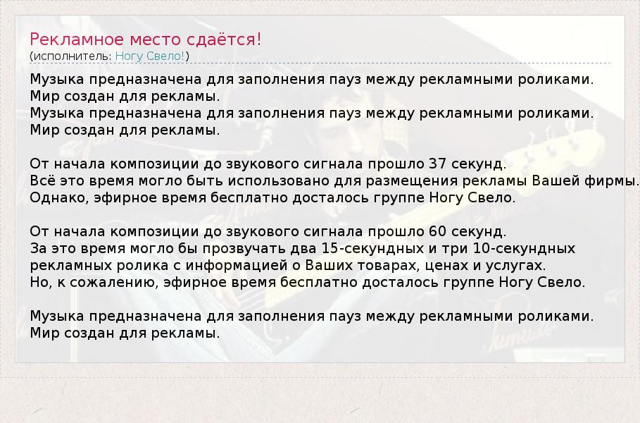 Музыка предназначена для заполнения пауз между рекламными роликами. Мир создан для рекламы. Музыка предназначена для заполнения пауз между рекламными роликами. Мир создан для рекламы. От начала композиции до звукового сигнала прошло 37 секунд. Всё это время могло быть использовано для размещения рекламы Вашей фирмы. Однако, эфирное время бесплатно досталось группе Ногу Свело. От начала композиции до звукового сигнала прошло 60 секунд. За это время могло бы прозвучать два 15-секундных и три 10-секундных рекламных ролика с информацией о Ваших товарах, ценах и услугах. Но, к сожалению, эфирное время бесплатно досталось группе Ногу Свело. Музыка предназначена для заполнения пауз между рекламными роликами. Мир создан для рекламы.