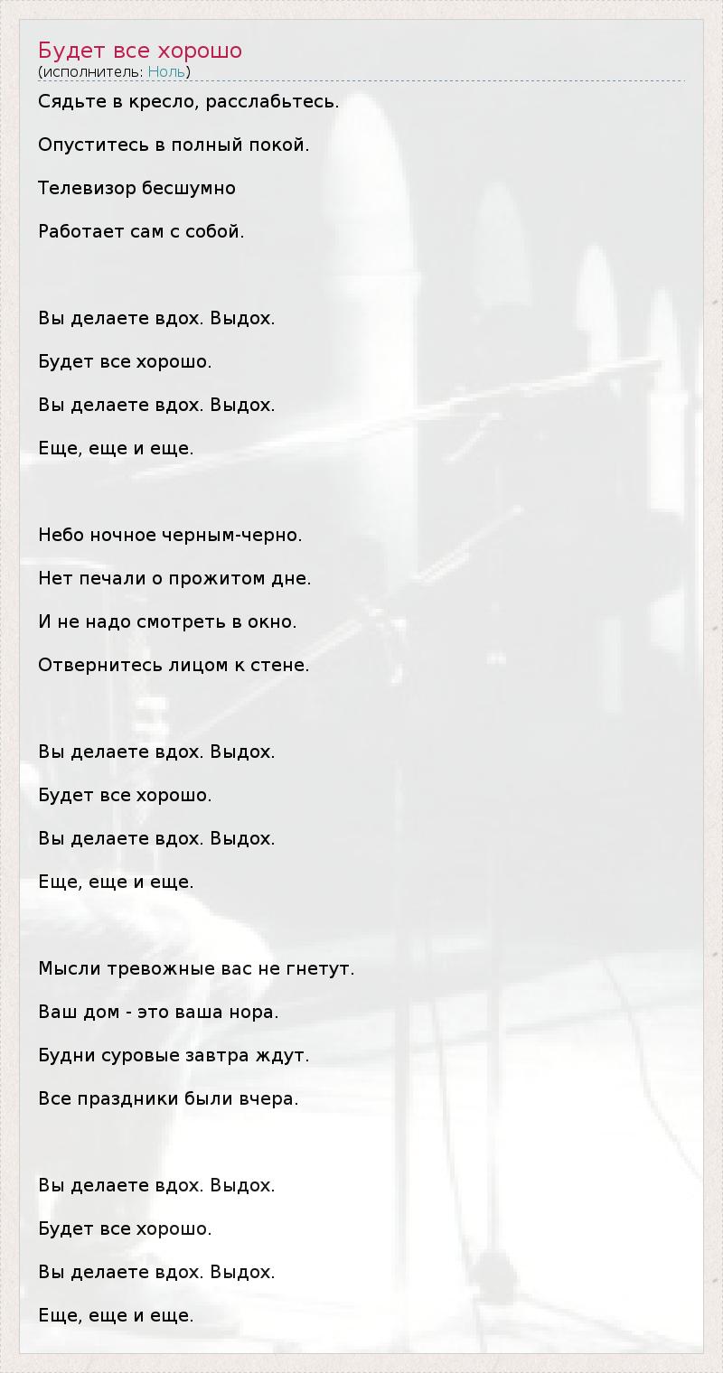 Сядьте в кресло, расслабьтесь. Опуститесь в полный покой. Телевизор бесшумно Работает сам с собой. Вы делаете вдох. Выдох. Будет все хорошо. Вы делаете вдох. Выдох. Еще, еще и еще. Небо ночное черным-черно. Нет печали о прожитом дне. И не надо смотреть в окно. Отвернитесь лицом к стене. Вы делаете вдох. Выдох. Будет все хорошо. Вы делаете вдох. Выдох. Еще, еще и еще. Мысли тревожные вас не гнетут. Ваш дом - это ваша нора. Будни суровые завтра ждут. Все праздники были вчера. Вы делаете вдох. Выдох. Будет все хорошо. Вы делаете вдох. Выдох. Еще, еще и еще.
