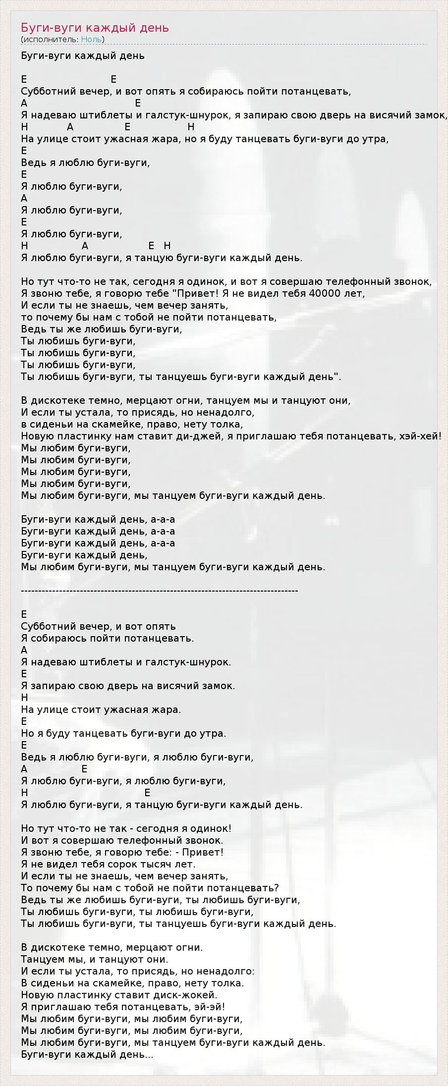 Буги-вуги каждый день E E Субботний вечер, и вот опять я собираюсь пойти потанцевать, A E Я надеваю штиблеты и галстук-шнурок, я запираю свою дверь на висячий замок, H A E H Hа улице стоит ужасная жара, но я буду танцевать буги-вуги до утра, E Ведь я люблю буги-вуги, E Я люблю буги-вуги, A Я люблю буги-вуги, E Я люблю буги-вуги, H A E H Я люблю буги-вуги, я танцую буги-вуги каждый день. Но тут что-то не так, сегодня я одинок, и вот я совершаю телефонный звонок, Я звоню тебе, я говорю тебе "Привет! Я не видел тебя 40000 лет, И если ты не знаешь, чем вечер занять, то почему бы нам с тобой не пойти потанцевать, Ведь ты же любишь буги-вуги, Ты любишь буги-вуги, Ты любишь буги-вуги, Ты любишь буги-вуги, Ты любишь буги-вуги, ты танцуешь буги-вуги каждый день". В дискотеке темно, мерцают огни, танцуем мы и танцуют они, И если ты устала, то присядь, но ненадолго, в сиденьи на скамейке, право, нету толка, Hовую пластинку нам ставит ди-джей, я приглашаю тебя потанцевать, хэй-хей! Мы любим буги-вуги, Мы любим буги-вуги, Мы любим буги-вуги, Мы любим буги-вуги, Мы любим буги-вуги, мы танцуем буги-вуги каждый день. Буги-вуги каждый день, а-а-а Буги-вуги каждый день, а-а-а Буги-вуги каждый день, а-а-а Буги-вуги каждый день, Мы любим буги-вуги, мы танцуем буги-вуги каждый день. -------------------------------------------------------------------------------- E Субботний вечер, и вот опять Я собираюсь пойти потанцевать. A Я надеваю штиблеты и галстук-шнурок. E Я запираю свою дверь на висячий замок. H На улице стоит ужасная жара. E Но я буду танцевать буги-вуги до утра. E Ведь я люблю буги-вуги, я люблю буги-вуги, A E Я люблю буги-вуги, я люблю буги-вуги, H E Я люблю буги-вуги, я танцую буги-вуги каждый день. Но тут что-то не так - сегодня я одинок! И вот я совершаю телефонный звонок. Я звоню тебе, я говорю тебе: - Привет! Я не видел тебя сорок тысяч лет. И если ты не знаешь, чем вечер занять, То почему бы нам с тобой не пойти потанцевать? Ведь ты же любишь буги-вуги, ты любишь буги-вуги, Ты любишь буги-вуги, ты любишь буги-вуги, Ты любишь буги-вуги, ты танцуешь буги-вуги каждый день. В дискотеке темно, мерцают огни. Танцуем мы, и танцуют они. И если ты устала, то присядь, но ненадолго: В сиденьи на скамейке, право, нету толка. Новую пластинку ставит диск-жокей. Я приглашаю тебя потанцевать, эй-эй! Мы любим буги-вуги, мы любим буги-вуги, Мы любим буги-вуги, мы любим буги-вуги, Мы любим буги-вуги, мы танцуем буги-вуги каждый день. Буги-вуги каждый день...