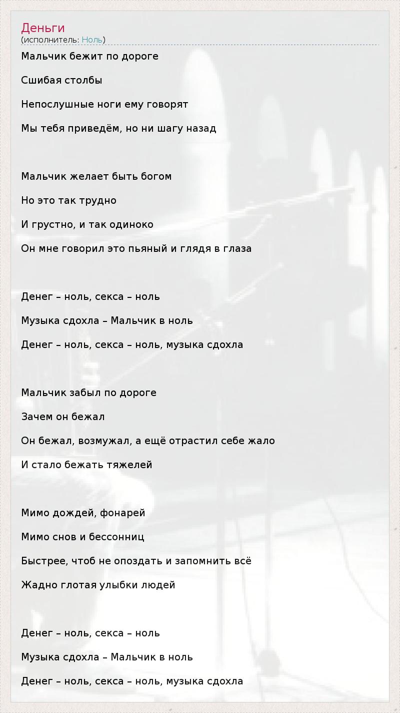 Мальчик бежит по дороге Сшибая столбы Непослушные ноги ему говорят Мы тебя приведём, но ни шагу назад Мальчик желает быть богом Но это так трудно И грустно, и так одиноко Он мне говорил это пьяный и глядя в глаза Денег – ноль, секса – ноль Музыка сдохла – Мальчик в ноль Денег – ноль, секса – ноль, музыка сдохла Мальчик забыл по дороге Зачем он бежал Он бежал, возмужал, а ещё отрастил себе жало И стало бежать тяжелей Мимо дождей, фонарей Мимо снов и бессонниц Быстрее, чтоб не опоздать и запомнить всё Жадно глотая улыбки людей Денег – ноль, секса – ноль Музыка сдохла – Мальчик в ноль Денег – ноль, секса – ноль, музыка сдохла