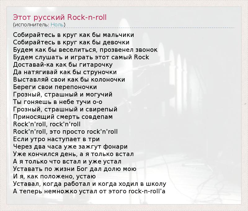 Собирайтесь в круг как бы мальчики Собирайтесь в круг как бы девочки Будем как бы веселиться, прозвенел звонок Будем слушать и играть этот самый Rock Доставай-ка как бы гитарочку Да натягивай как бы струночки Выставляй свои как бы колоночки Береги свои перепоночки Грозный, страшный и могучий Ты гоняешь в небе тучи о-о Грозный, страшный и свирепый Приносящий смерть совдепам Rock'n'roll, rock'n'roll Rock'n'roll, это просто rock'n'roll Если утро наступает в три Через два часа уже зажгут фонари Уже кончился день, а я только встал А я только что встал и уже устал Уставать по жизни Бог дал долю мою И я, как положено, устаю Уставал, когда работал и когда ходил в школу А теперь немножко устал от этого rock-n-roll'а